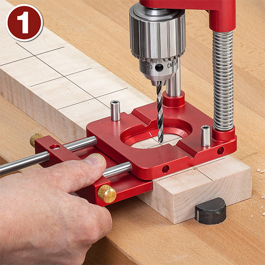 A v-groove in the base allows for easy centered drilling of round stock such as wood dowels.